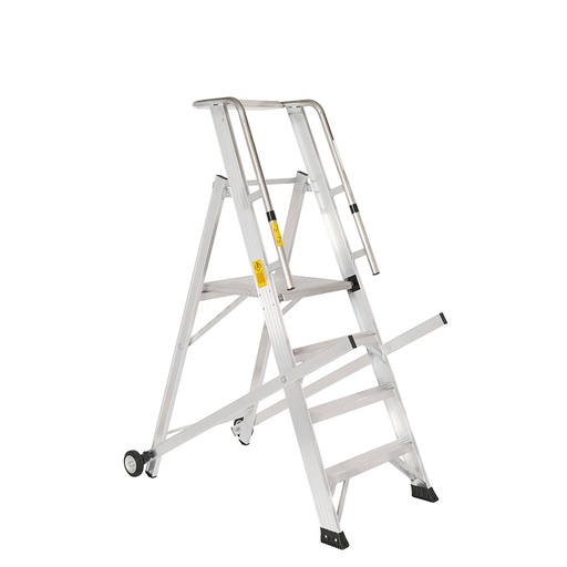 Regalna lestev izdelana iz rebrastega aluminija, z 2 zadnjima kolesoma dimenzije 125mm opremljena z zavornim sistemom kateri je samodejno aktiviran, ko se lestev uporablja v delovnem položaju in zaščito pred nenamernim odpiranjem / zapiranjem.